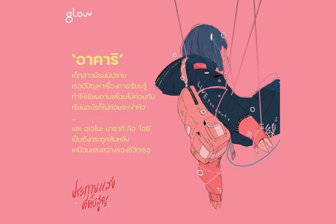ในวรรณกรรมแปลญี่ปุ่นเรื่อง ‘ประกายแสงที่ดับสูญ’ ของสำนักพิมพ์ glow ตัวละครหลักอย่างอาคาริก็มี ‘โอชิ’ เหมือนกัน นั่นคือ อุเอโนะ มาซากิ อาคาริเป็นเด็กสาวผู้โดดเดี่ยว ทั้งยังมีปัญหาเรื่องการสื่อสาร ได้เปิดบล็อกสำหรับซัพพอร์ตโอชิ อุทิศทั้งชีวิตให้กับโอชิ เพราะเขาเป็นแสงสว่างเพียงหนึ่งเดียวของเธอ และเปรียบดังกระดูกสันหลังที่คอยค้ำจุนให้เธอยืนหยัดและก้าวเดินต่อไป
