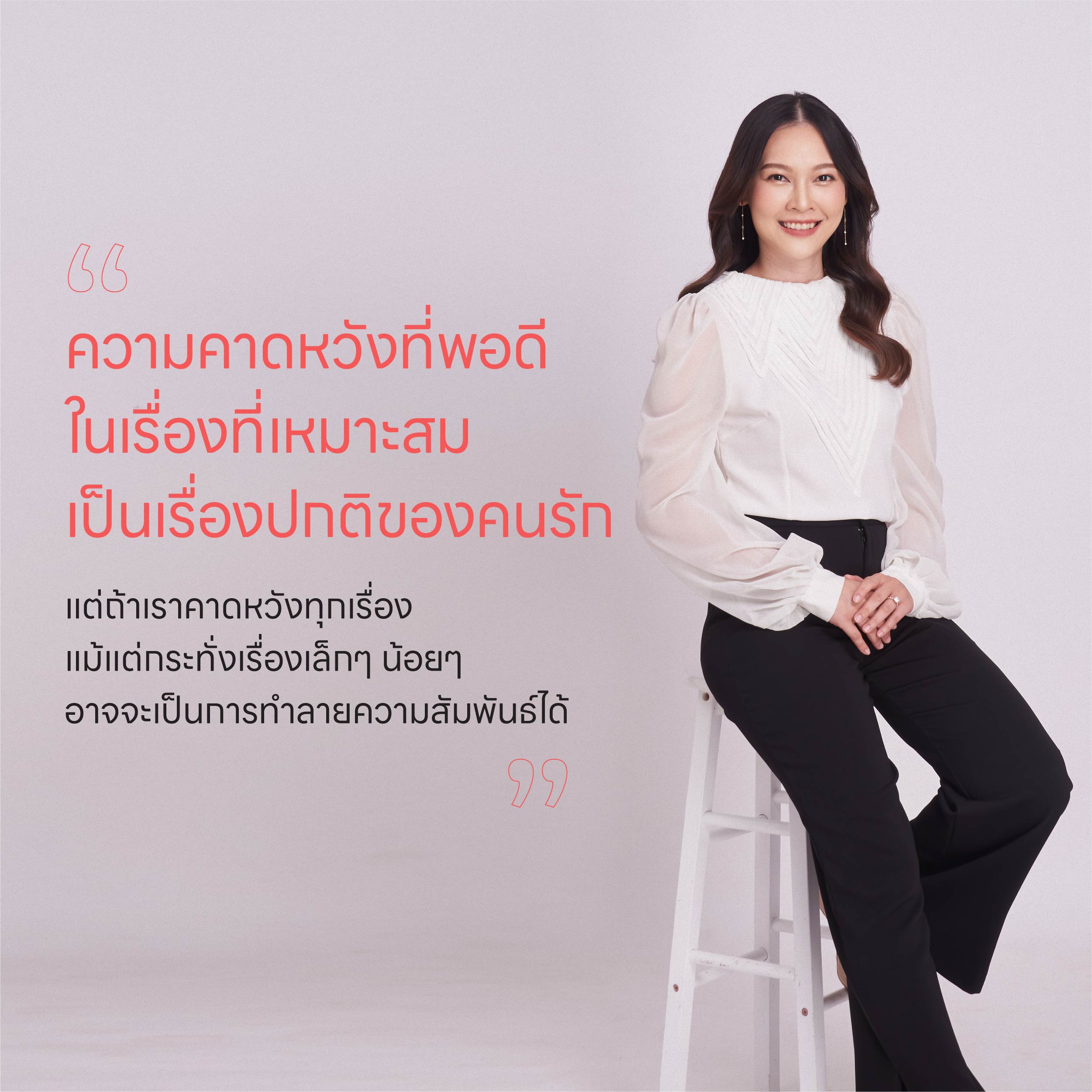ความคาดหวังที่พอดีในเรื่องที่เหมาะสมเป็นเรื่องปกติของคนรัก แต่ถ้าเราคาดหวังทุกเรื่อง แม้แต่กระทั่งเรื่องเล็กๆ น้อยๆ อาจจะเป็นการทำลายความสัมพันธ์ได้ ดังนั้นอยากให้พูดคุยกันว่าเรื่องไหนสามารถปรับได้ เรื่องไหนอาจจะต้องวางใจลง หมอเชื่อว่าถ้าคนสองคนอยู่ด้วยกันบนพื้นฐานของความรัก ย่อมอยากทำให้อีกฝ่ายมีความสุข แม้การปรับตัวอาจไม่ได้เปลี่ยนแปลงทันทีทันใด แต่ค่อยเป็นค่อยไป ก็ทำให้เราเห็นความพยายามของอีกฝ่าย และบางเรื่อง หากลดความคาดหวังลงได้บ้าง ก็จะช่วยให้ความสัมพันธ์ดีขึ้นได้ค่ะ
