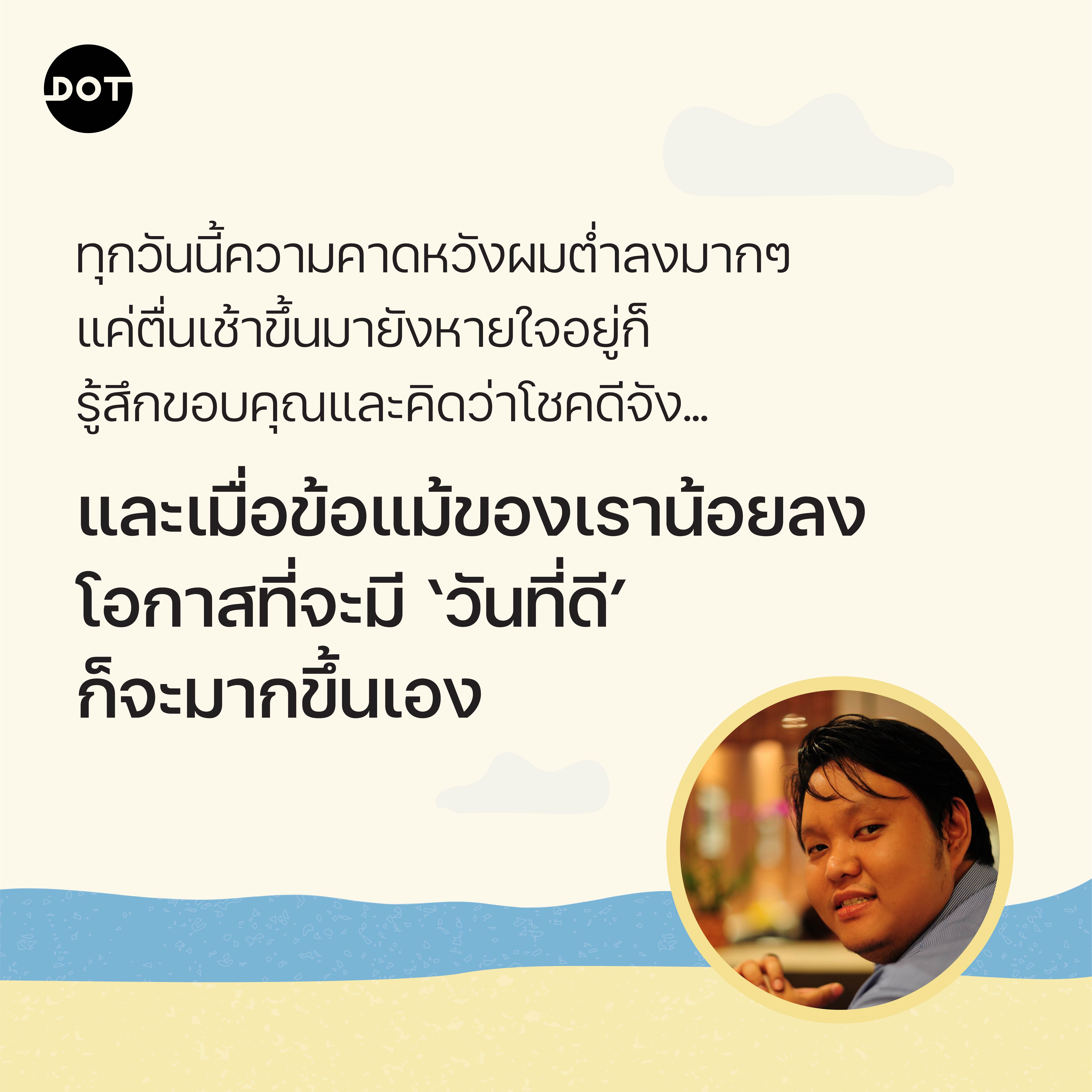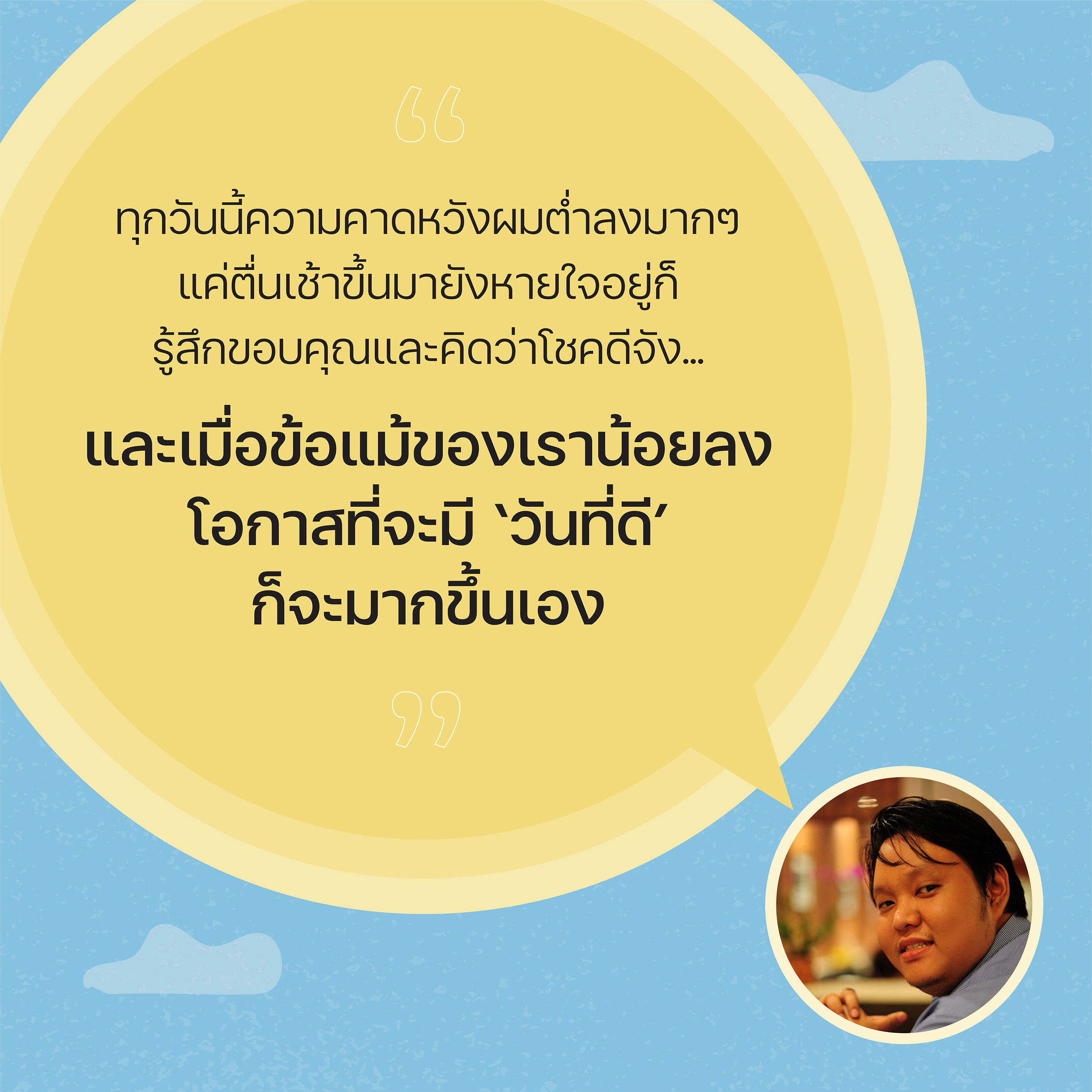 มีประโยคหนึ่งที่ผมชอบเขากล่าวไว้ว่า ชะตาฟ้าลิขิต ชีวิตเราเลือกเดิน เพราะโชคชะตาพาเรื่องไม่คาดคิดเข้ามาในชีวิตเราตลอดเวลา ดีบ้าง ร้ายบ้างปะปนกันไป และแม้เราจะพยายามบริหารจัดการความเสี่ยงให้เรื่องร้ายๆ เกิดขึ้นกับเราน้อยที่สุด แต่เรื่องบางเรื่องป้องกันยังไงมันก็เกิดขึ้นอยู่ดี ถ้าหากเราเอา วันที่ดี ไปผูกไว้กับความคาดหวังว่าทุกอย่างต้องได้อย่างใจ เราก็คงพบกับความผิดหวังอยู่บ่อยๆ และไม่ค่อยได้มีวันดีๆ กลายเป็นว่าตัวเราเองนั่นแหละตั้งข้อแม้ในการมีความสุข ดังนั้นการที่จะมีวันที่ดีได้ ไม่ใช่เพราะเราคาดหวังให้ชีวิตไม่เกิดปัญหา แต่อยู่ที่การเตรียมตัวเองให้พร้อมที่จะมี สติ และ ปัญญา ในการจัดการปัญหาต่างๆ ที่เข้ามา แน่นอนว่าแม้แต่ผมเองก็ยังจัดการปัญหาต่างๆ ได้ไม่ดีนักในบางครั้ง แต่ก็พยายามเรียนรู้จากความผิดพลาดและตั้งใจว่าจะไม่ทำผิดซ้ำ ทุกวันนี้ความคาดหวังผมต่ำลงมากๆ แค่ตื่นเช้าขึ้นมายังหายใจอยู่ก็ รู้สึกขอบคุณและคิดว่าโชคดีจัง... และเมื่อข้อแม้ของเราน้อยลง โอกาสที่จะมี วันที่ดี ก็จะมากขึ้นเอง